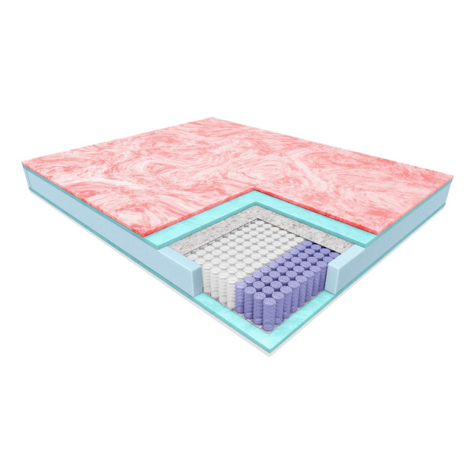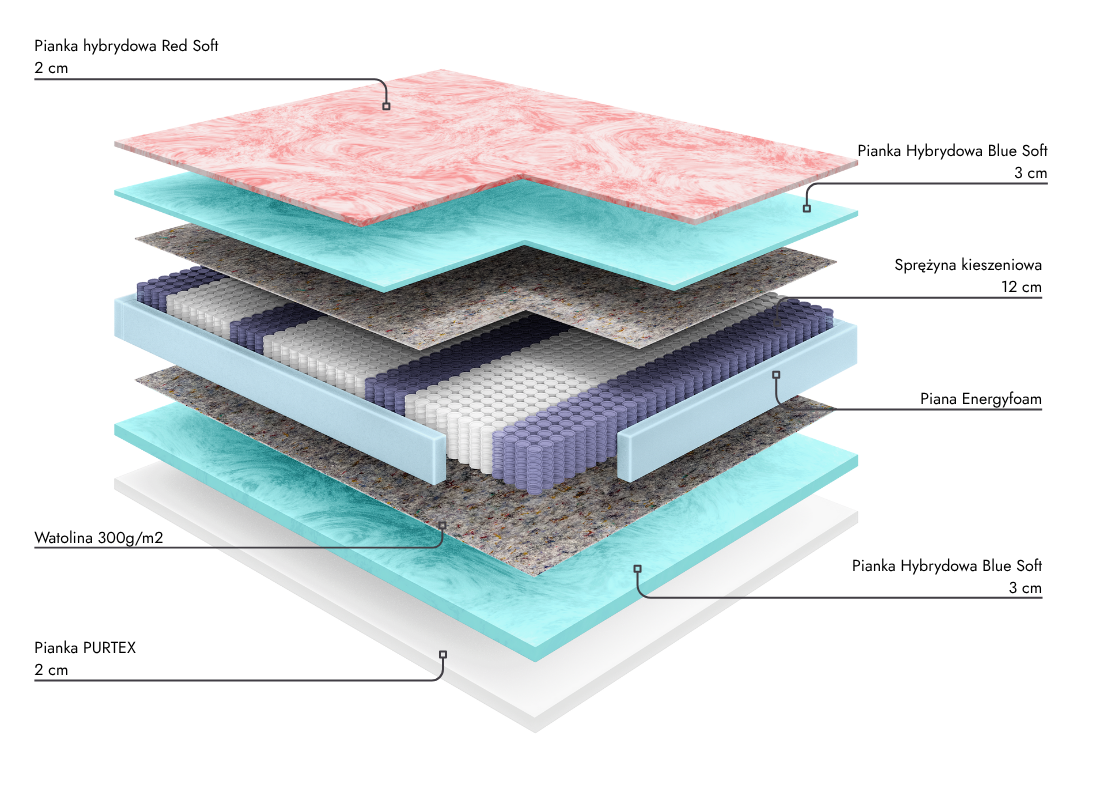 • Pianka hybrydowa Red Soft (2 cm) – innowacyjna pianka o żelowej konsystencji i gęstości 38 kg/m³. Dynamicznie reaguje na zmianę pozycji ciała, zapewniając komfortowe dopasowanie i stabilne podparcie kręgosłupa.